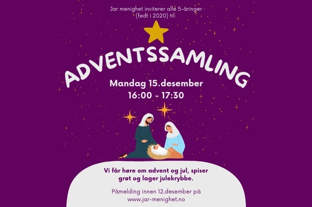 Mandag 15.desember kl. 16:00-17:30 ønsker vi alle 5-åringer m/voksen velkommen til adventssamling i Jar kirke. Les mer og meld deg på her! ...