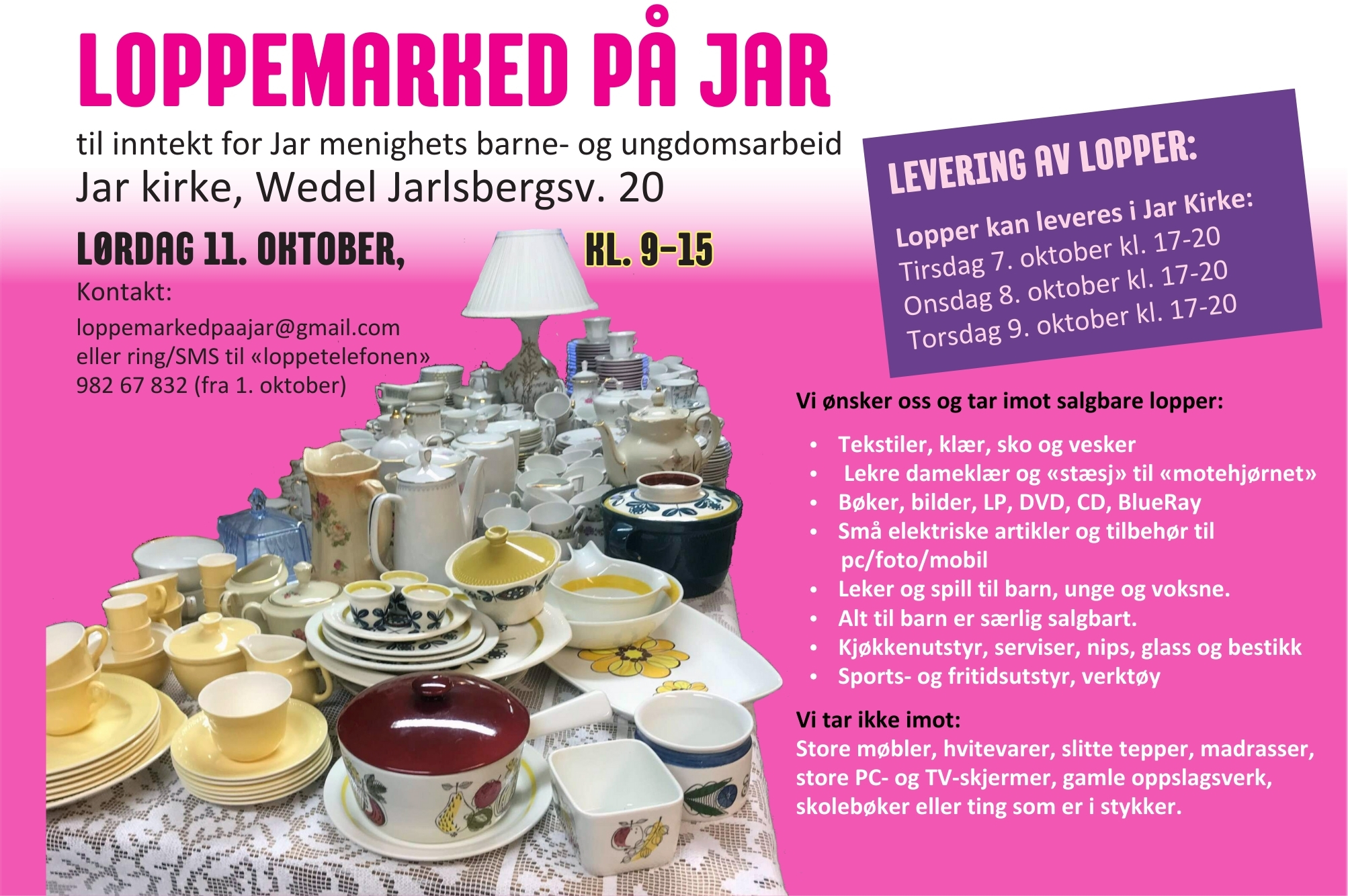 Årets loppemarked 2025 går av stabelen 11.oktober kl.9-15, og alle inntektene er øremerket Jar menighets barne- og ungdomsarbeid.