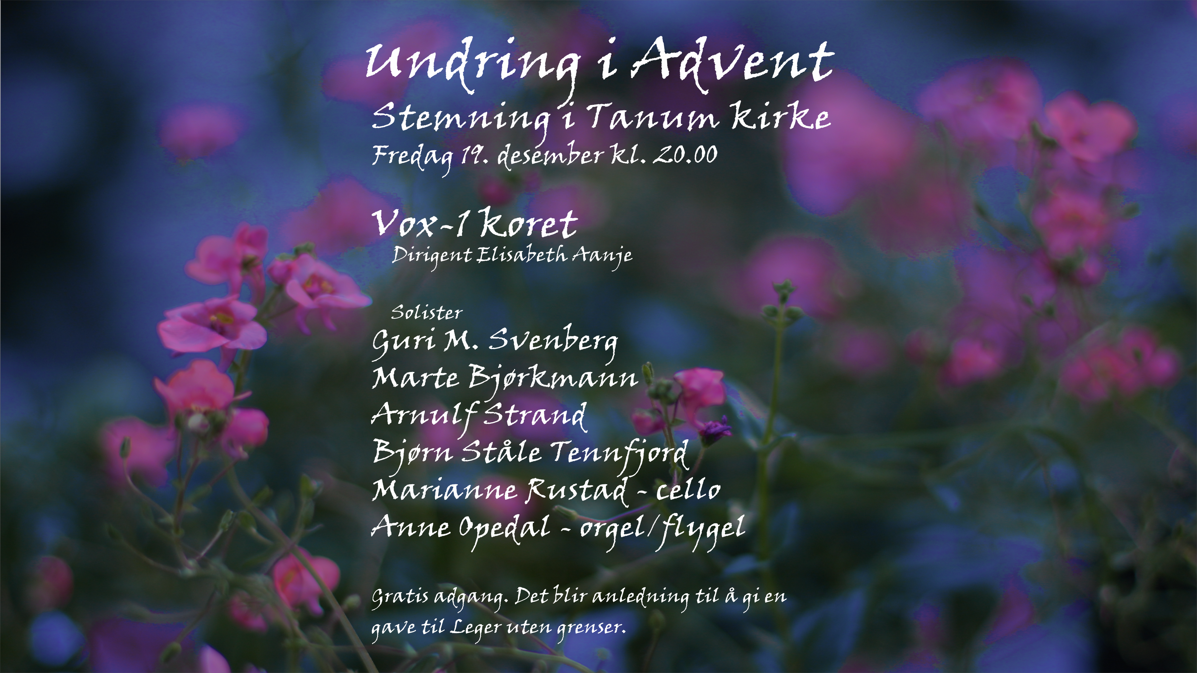 Vox-1 koret inviterer til sin årlige konsert "Undring i advent" fredag 19. desember kl. 20, ved dirigent Elisabeth Aanje. Gratis adgang og innsamling til Leger uten grenser.